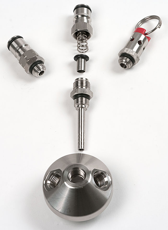 Solid stainless steel construction (type 304). It features a 30 PSI relief valve, and the head can be completely disasembled for cleaning and repair. All parts are standard, including the ball lock posts, O rings, and even the relief valve.