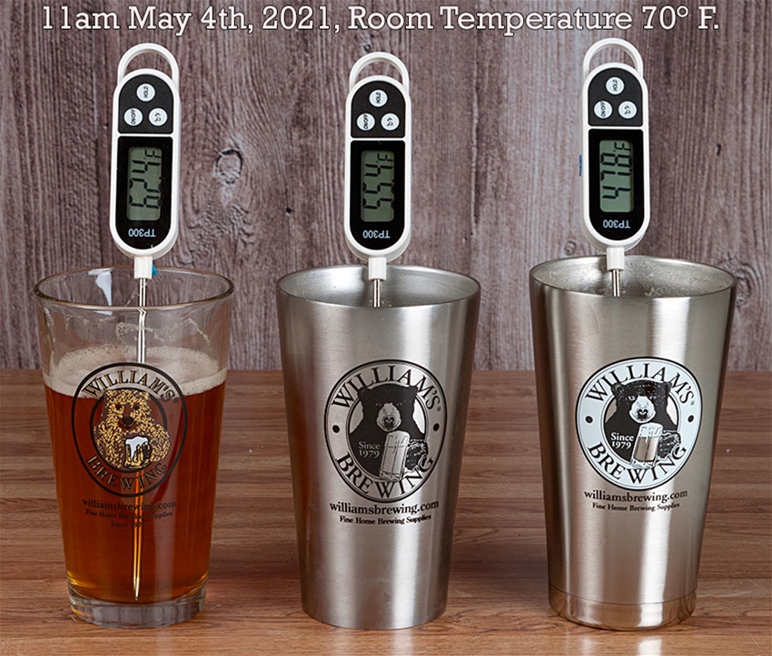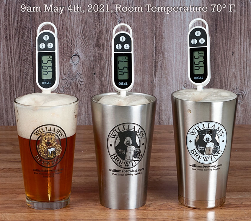 In a 70° room, it only allows 16 ounces of 45° F. beer to lose 1.2° degrees F. per hour, while a similar double wall stainless pint without vacuum insulation loses 5° F. per hour, and a standard glass 16 ounce pint glass loses 9.6° F. in the first hour.