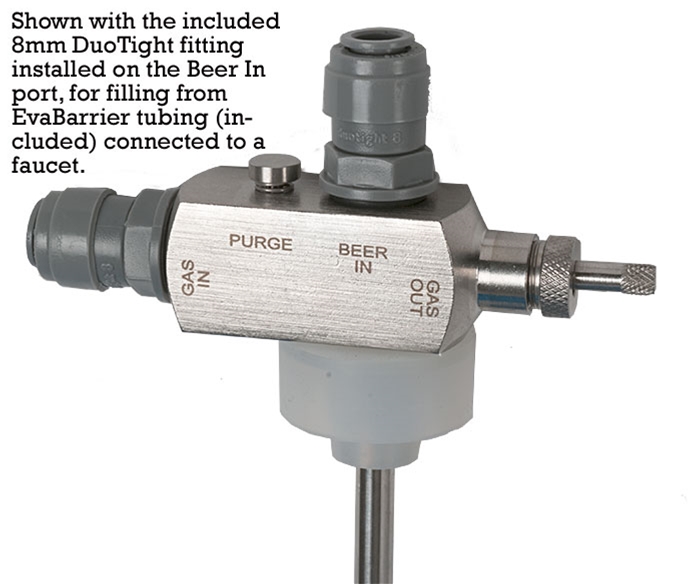 For the gas inlet side, a male ball lock fitting is provided, so you can use any ball lock gas connector to attach the C02 purging gas. This gas should be at the same pressure as your kegerator dispensing gas, and should be connected to your kegerator C02 regulator. Not Included: you will need a spare gas line from your regulator kegging system with a female ball lock on it to connect your purging C02 gas.