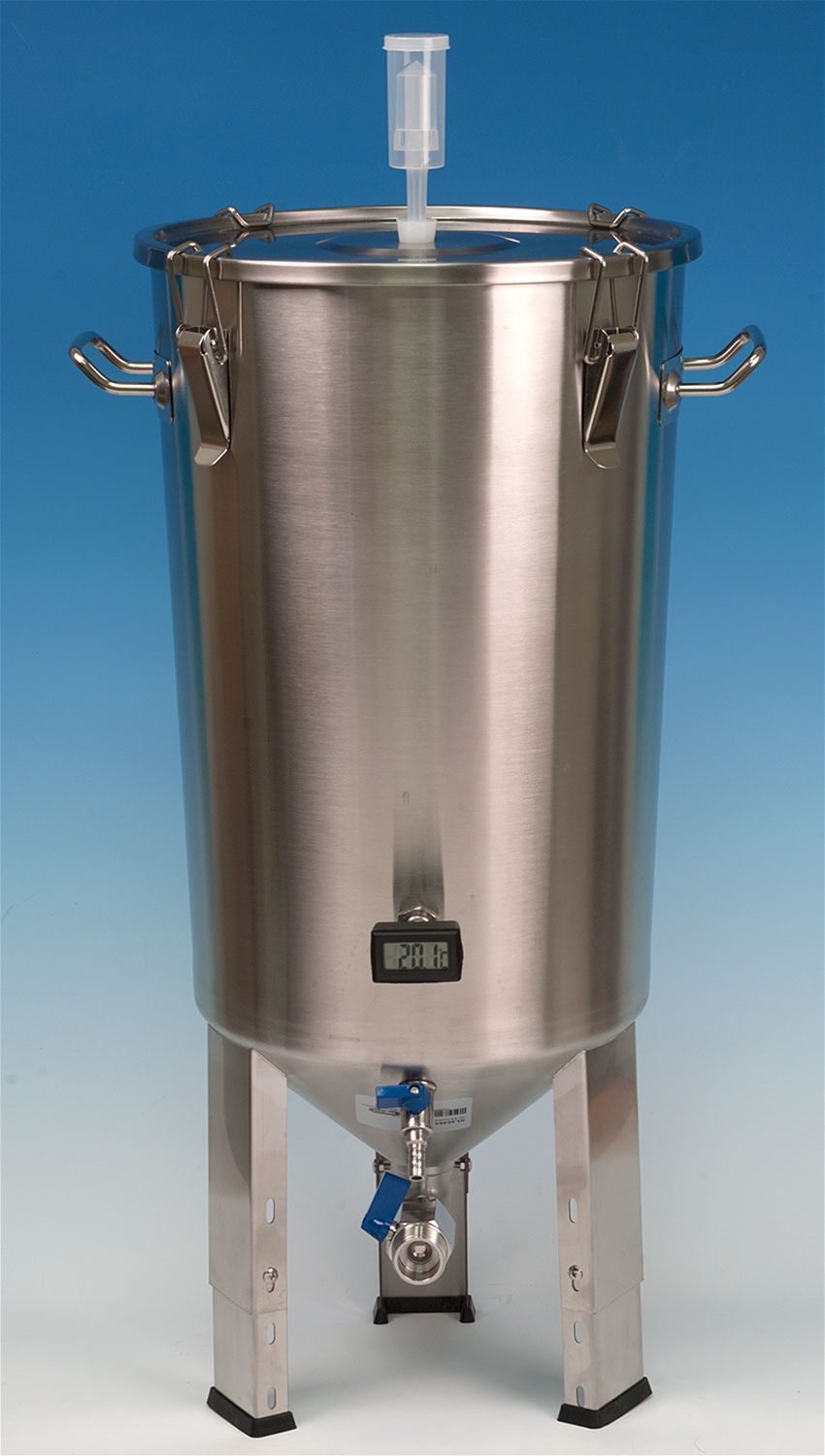 The stainless lid is silcone gasket sealed, and a thermowell with removable digital centigrade only thermometer is provided, which has a ¼” inner diameter to accept probes from all the temperature controls we sell, including the RAPT Temperature Controller. The centigrade thermometer runs on two included LR44 button batteries.