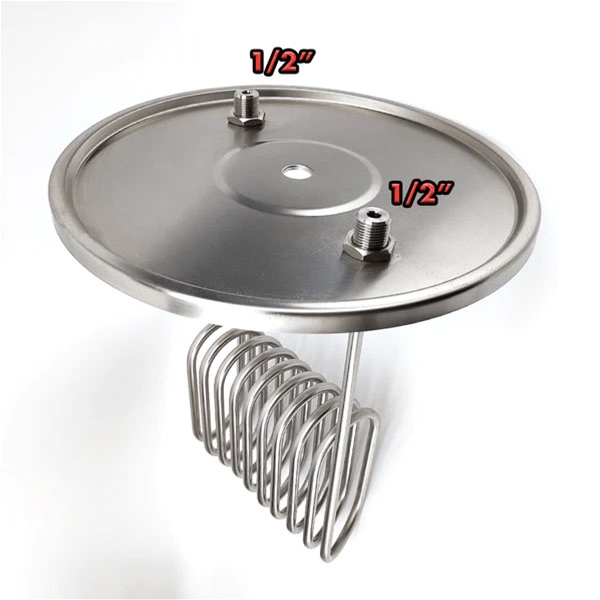 This all stainless unit fits the 32 Liter KegLand Conical Fermenter, and makes it easy to run cooling or heating water or glycol through your fermenter to achieve precise temperature control. It measures 14" from the bottom base of the stainless lid to the end of the coil.