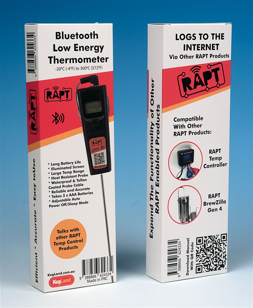If you have a RAPT device, you know how handy it would be if you could have temperature data input into your RAPT control profiles. This RAPT enabled Bluetooth Thermometer is compatible with the Gen 4 BrewZillas and RAPT Temperature Controllers and RAPT Fermentation Chambers.