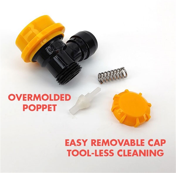 The small form factor allows for easy stacking of rubber top kegs (they are 1¾" tall). The new cap design ensures a pressure seal with just hand tightening and it can be completely taken apart for cleaning with no tools required in case it gets clogged.