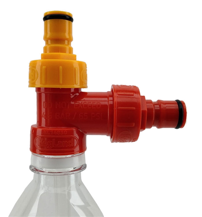 Differentiate your beer and gas line inputs. This molded yellow male ball lock valve coupling cap that fits a 2 liter or smaller plastic soda bottle with a 28mm screw cap lid. This allows the 2 liter bottle to be charged with C02 from any female ball lock gas fitting (like our item D32 or D03 Gas Connector), carbonating the cold beverage in the bottle. Great for serving draft beer away from the keg. Also fits the 27 and 55 Liter Brewzilla in and out ports on the lid (except the Flat Bottom 30 Liter Brewzilla), and the Brewzilla Collection Jar ports for pressurizing the Brewzilla fermenter.