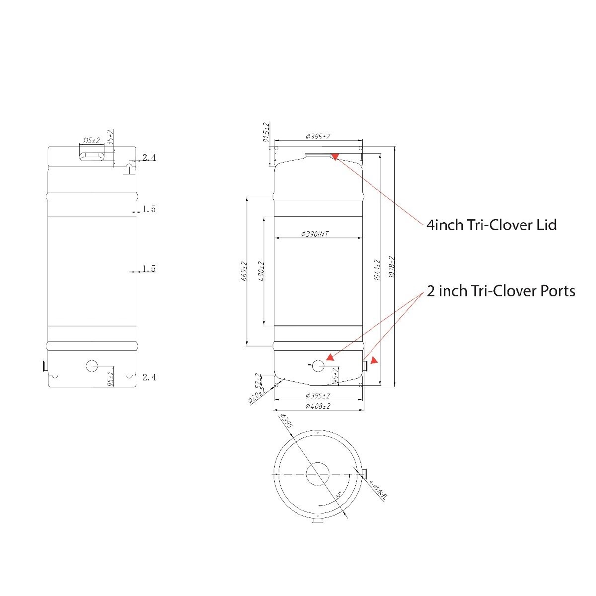 The Kegmenter is a 31 gallon (118 liter) 304 stainless keg with a 4” diameter tri clover lid with flat lid and airlock. It also features two 2" tri clamp ports on the base, so you can adapt this to many purposes. 42½" tall, 16" wide,