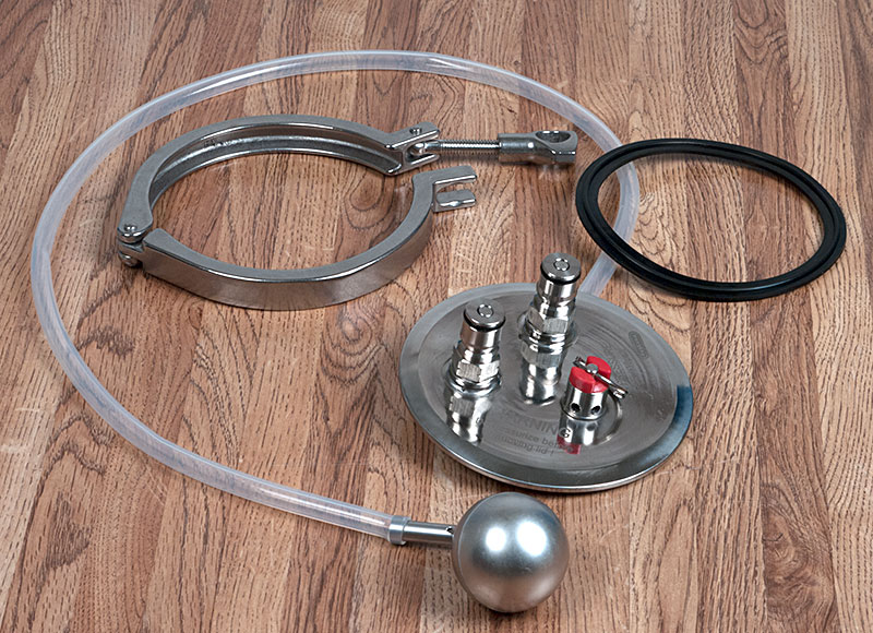 The Kegmenter is a 7.6 gallon (29 liter) 304 stainless keg with a 4” diameter tri clover lid on the top. Ball lock fittings with dip tubes are built into the lid so you can use this as either a large ball lock keg or a 10 gallon fermenter. The beer dip tube features a silicone hose and floating pick up ball, to collect the clearest beer from the top of the keg.