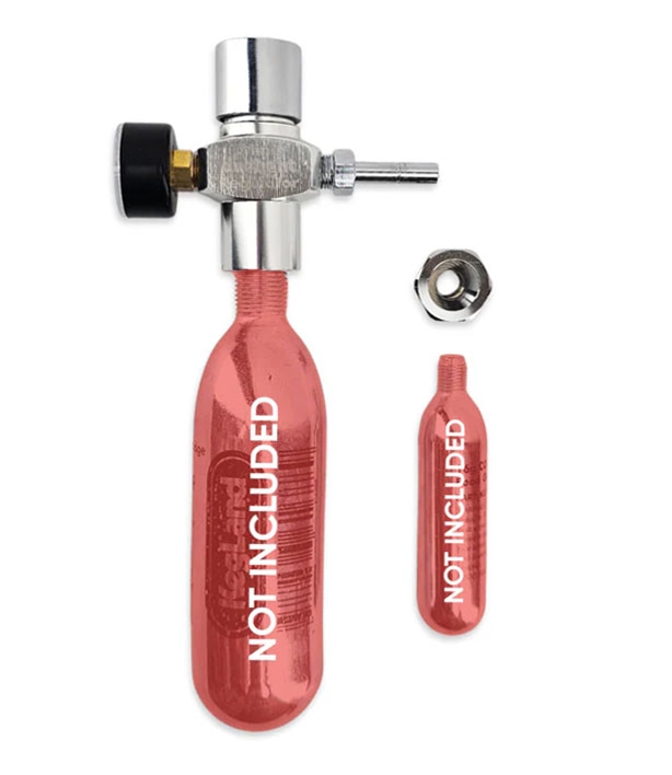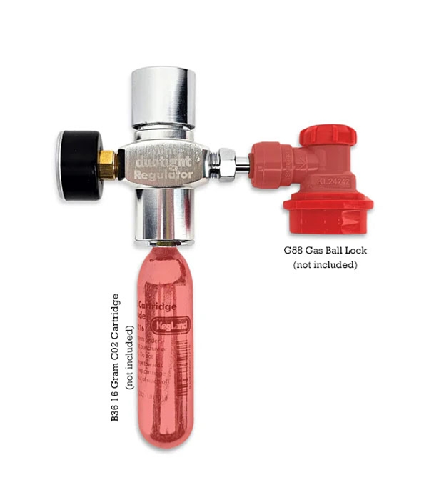 This Mini Duotight Regulator features a 6.35mm exit hose barb to fit our Duotight reducer item Z84, or Doutight Ball Lock Fitting item G58. It fits threaded 16 gram C02 cartridges (item B36). It will also fit conventional C02 tanks with our optional adapter item S78.