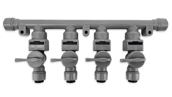 DuoTight Manifolds making using EvaBarrier tubing easier than ever. Unlike aluminum manifolds, these feature removable and cleanable check valves, and don't weigh much so you can easily mount them most anywhere. The double O ring DuoTight valves make it easy to make a leakproof gas distribution system.