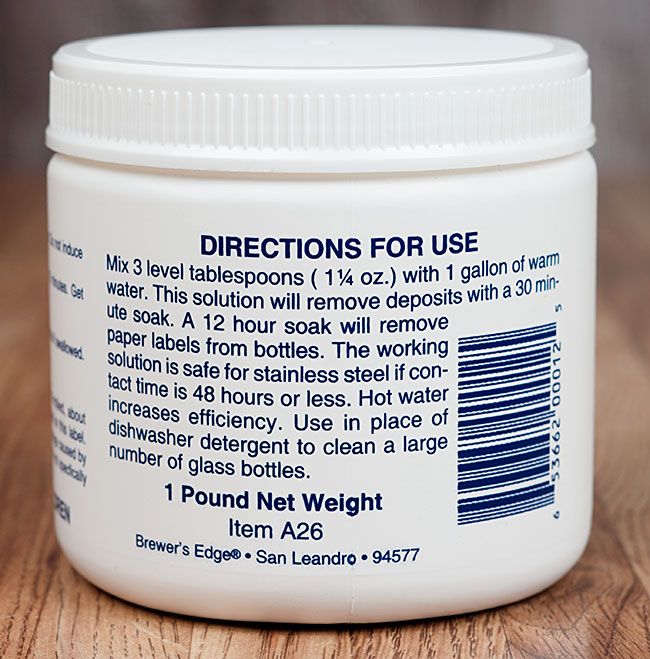 We think this is one of the most potent organic deposit remover available. Formulated with more sodium percarbonate than other oxygen based brewing cleansers, for faster organic deposit removal. Outstanding for removing paper labels and organic deposits from all brewing equipment. In our tests compared with PBW, Brewer's Edge® Oxygen Cleanser had less foaming upon mixing than PBW, and was just as effective at removing organic deposits.