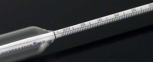 This shows a closeup of the calibrations on this Brewer's Edge Precision Specific Gravity hydrometer.