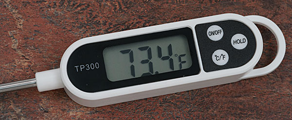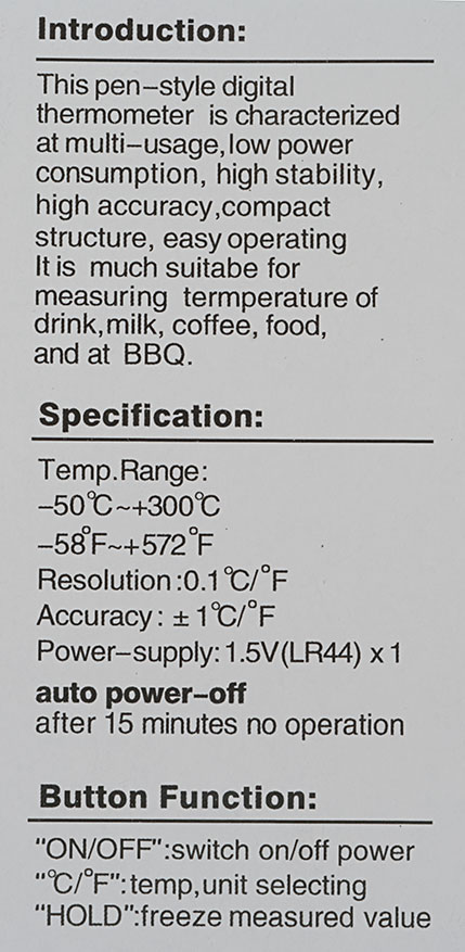 This 9.5" long digital thermometer (with a 5.5" long stainless probe) features quick response, a range of -58 F to 572 F, accuracy of plus or minus 1 degree, easy to use controls, and an easy to read display. Auto shut off after 15 minutes protects the LR44 battery from draining.