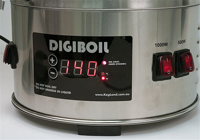 Note that the Digiboil was designed for boiling, and does not have the low density heating elements of say a Mash & Boil or Brewzilla, so when the malt pipe is in place, you will need to use the 500 watt element only to prevent grain from burning onto the element.