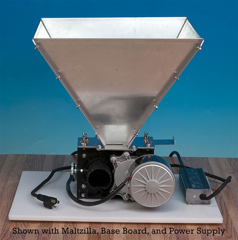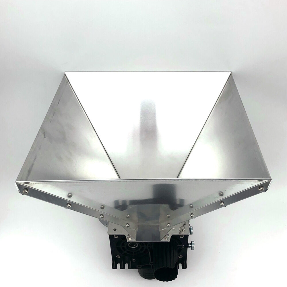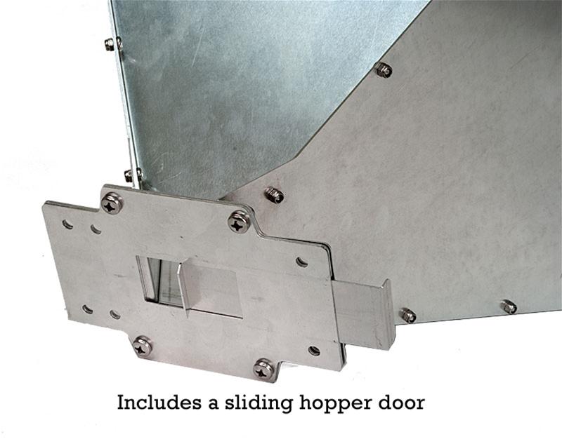 This large aluminum hopper holds up to 16 pounds of malt. For smooth grain flow, all assembly bolts are on the outside of the hopper, to prevent even one kernel of malt from being left behind. A sliding hopper door at the base makes it easy to shut off the flow of grain if desired. 13.5" by 13.5" in diameter at the top when assembled, and 15" tall.