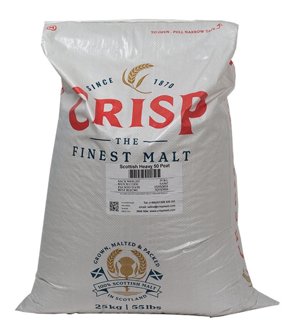 This Scottish-grown spring barley malt is slowly smoked using peat from Aberdeenshire. Slow smoking allows the fullest absorption of phenols by each grain, and this malt is typically measured at almost 50ppm of total phenols. The result is a depth of flavor that is resistant to fade in storage and will provide a definitive peat character to your whiskly. Malted by Crisp Malting.