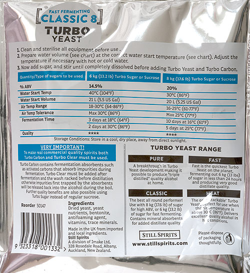 Classic is the best all rounder Turbo Yeast, performing well under most conditions. Use with 8 kg of sugar for high ABV, or 6 kg of sugar for fast fermenting. Classic has been further improved with the inclusion of new mineral absorbents, further improving distillate quality.