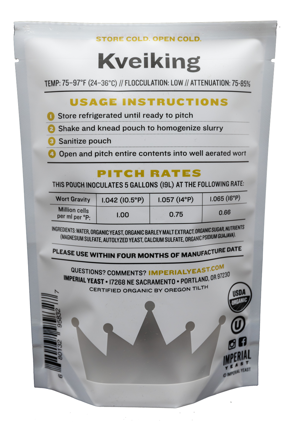 This Kveiking blend of three yeasts thrives in hot fermentations when big complex ester profiles are desired. A low pitch rate can be used to drive these aromatics even higher but the brewer should ensure this low pitch rate can be combined with a continuously high fermentation temperature. If the temperature drops too low, the corresponding level of attenuation can be low, with high terminal gravities. This blend contains flocculent and non-flocculent yeast strains, therefore the clarity of the final beers produced can be variable. Use this blend for anything from new school hazy IPAs to traditional Norwegian farmhouse brews. The Kveiking blend also works well when fermenting kettle soured worts for a strong tropical fruit character.