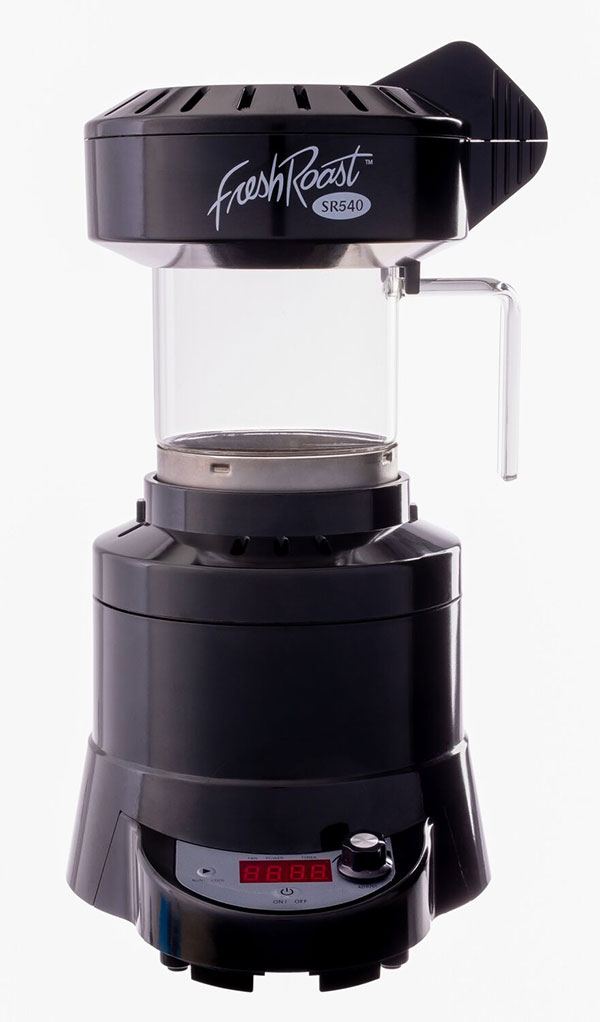 The SR540 is a time tested air roaster. Coffee roast capacity is 4.2 ounces, or 4 scoops with the included measuring cup. It has an intuitive control board - all adjustments are made with pushing the knob and turning to adjust the heat, fan, and time. Fresh Roast 540 also features a real-time temperature read out to monitor roast progress. A quick turn of the knob to the right will display current temperature.