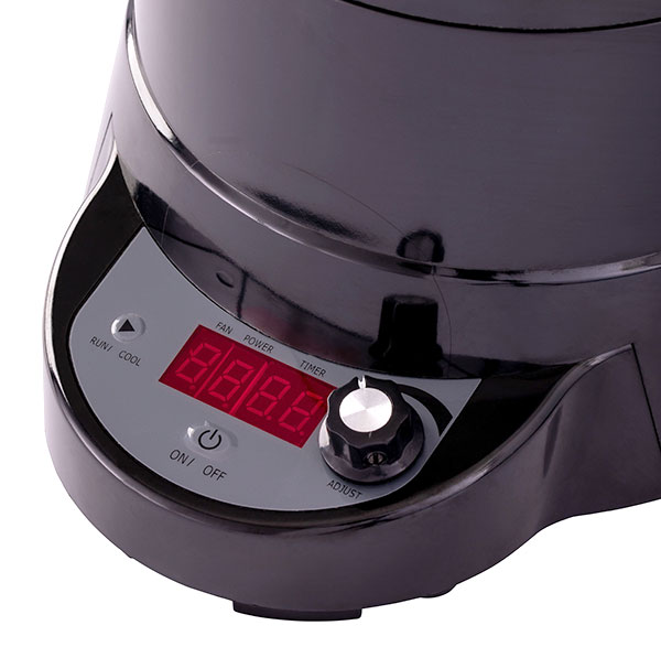There are 9 levels of heat adjustment and an adjustable fan which you can adjust based on the weight and moisture content of the beans. 12.5" tall, 8.5" deep.