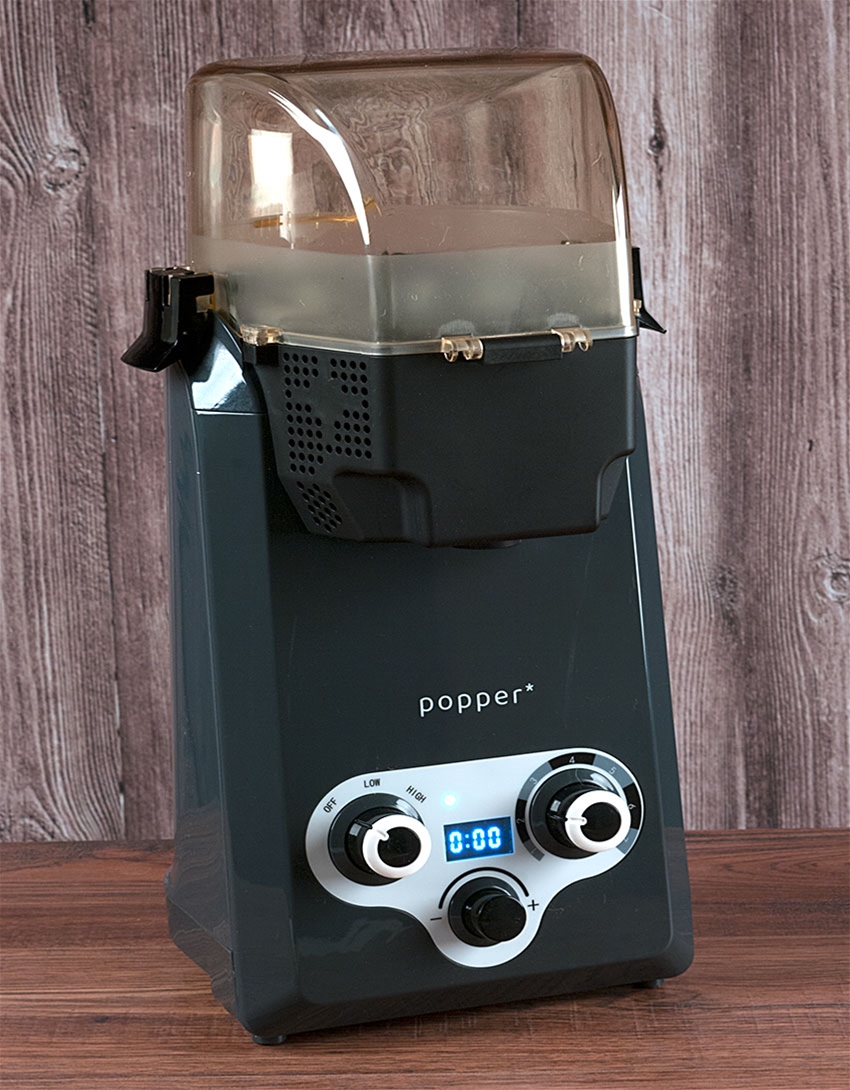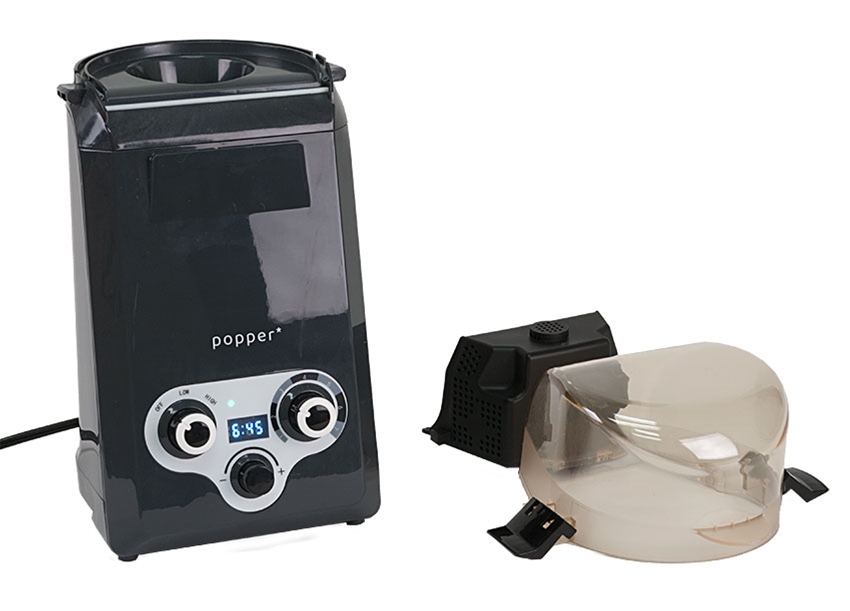 Looking for an affordable entry into home coffee roasting? Check out the second generation Popper Coffee Roaster from Agnes LLC. It is based on an air popcorn popper, and roasts 3 to 3½ ounces of green coffee in seven minutes or less, then cools for three minutes. Unlike a popcorn popper, you can adjust heat, fan speed and the roast time manually. This second generation model features 7 heat stages, as well as an improved fan motor and heating control.