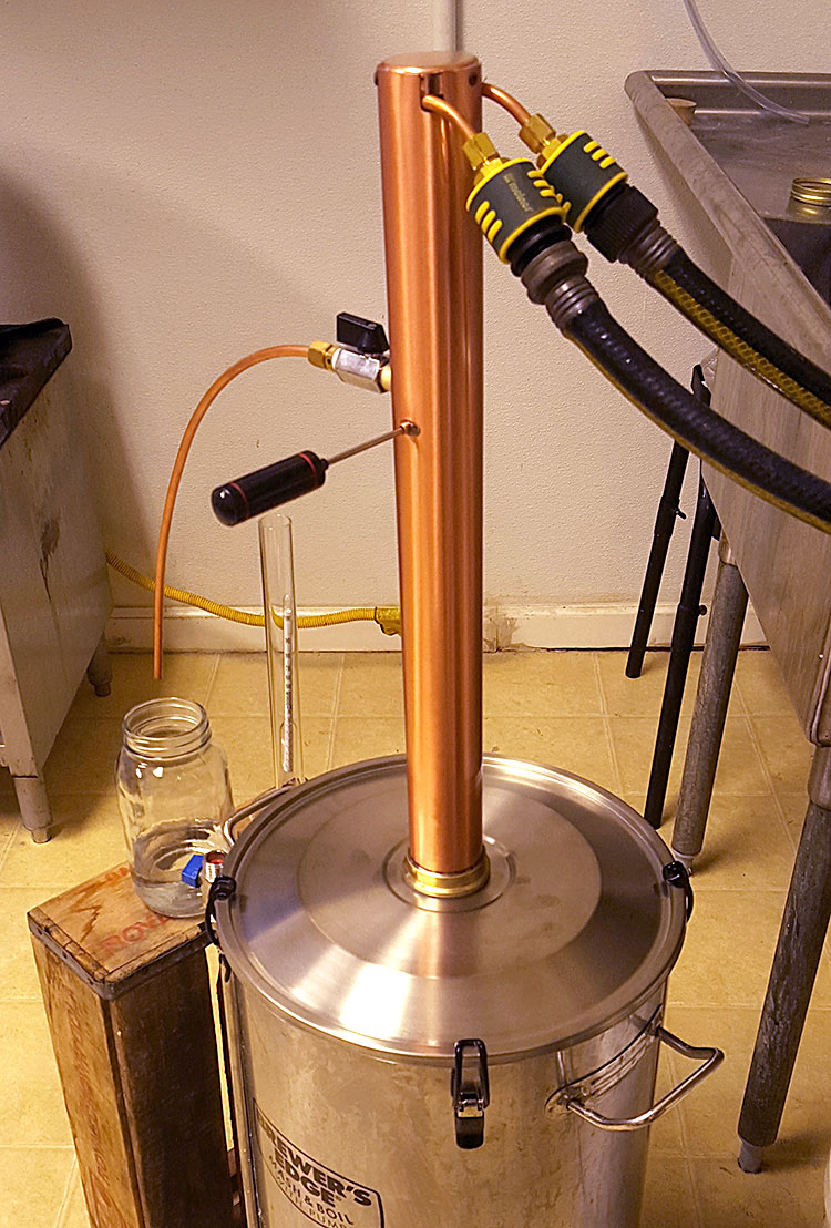 Also included are a stainless distilling lid with silicone sealing gasket to fit Grainfather. This does not fit the Mash & Boil. To measure the proof your distillate, a glass hydrometer jar and Alcometer are also provided. Our Q74 Cooling Connection Kit with 20' of hose is included, so you can connect the still head to a male garden hose type faucet for needed cooling.