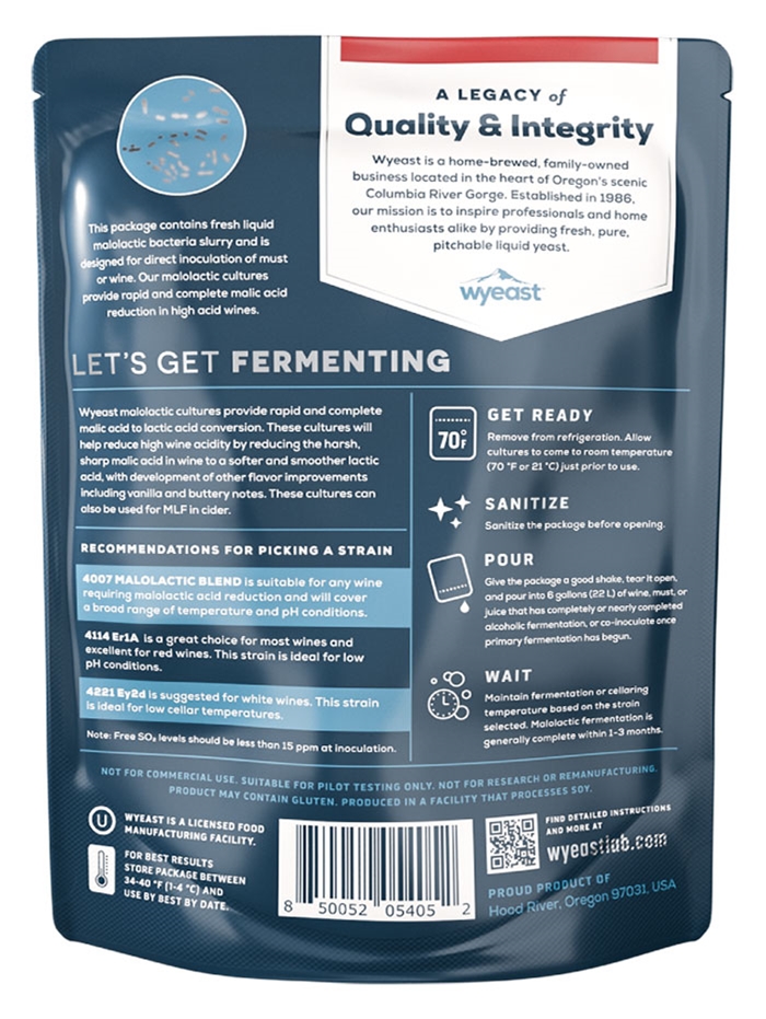 Produced by Wyeast Laboratories, and needed if your freshly-picked grapes are too acid (common in cool climates, not common in hot climates like much of California). Fresh liquid cultures of L. oenos ER1A and EY2D provide rapid and complete malic acid to lactic acid reduction to balance and soften wines. ER1A and EY2D perform well in conditions of low pH and cool cellaring.